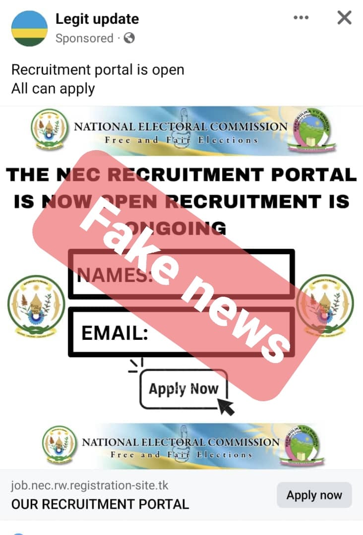 Komisiyo y'Igihugu y'Amatora iramenyesha abantu bose ko nta kazi iriho itanga muri iki gihe.